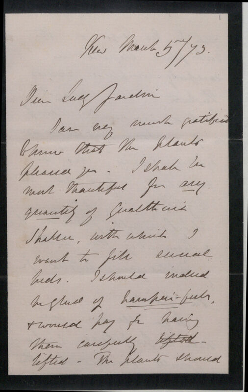 I am very much gratified to know that the plants pleased you. I shall be most thankful for any quantity of Gualtheria[sic] *2 Shallon, with which I want to fill several beds. I should indeed be glad of hampers'--full, & would pay for having them carefully lifted lifted. The plants should