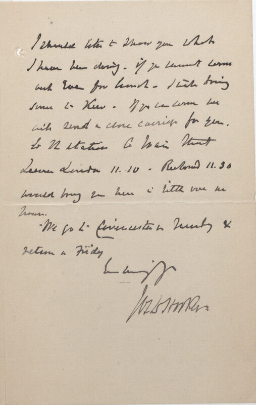 I should like to show you what I have been doing. If you cannot come but even for lunch -- I will bring some to Kew. If you can come we will send a close[?] carriage for you to the station. A train that leaves London 11. 10 - Returned[?] 11.30 would bring you here in little over an hour. We go to Cirencester on Tuesday & return on Friday[.]