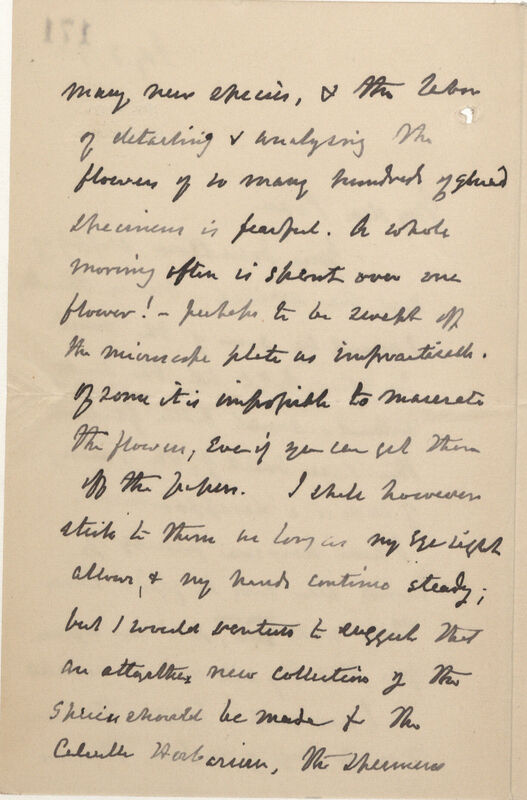 many new species, & the labor[stet] of detailing & analysing the flowers of so many hundreds of glued specimens is fearful. A whole morning often is spent over one flower! -- perhaps to be swept off the microscope plate as impractical. Of some it is impossible to macerate the flowers, even if you can get them off the papers. I shall however stick to them as long as my eyesight allows & my hands continue steady; but I would venture to suggest that all altogether new collections of the species should be made for the Calcutta Herbarium, the specimens