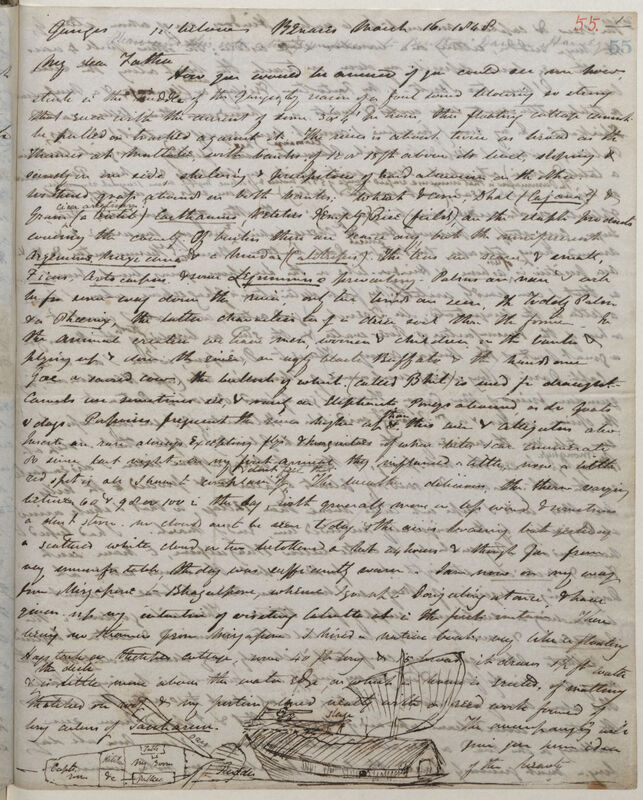 JDH is on the Ganges en route from Mirzapore to Bhagulpore & Darjeeling . He describes the climate & riverbank vegetation: grass, Dhal, Grain, Cicer arietinum lentil, Carthamus, Vetches, rice, Argemone mexicana, a Mudar possibly Calotropis sp., Ficus, Artocarpus, Leguminosae, Toddy Palm, a Phoenix, also animals. He describes his boat, Hindu crew & travelling set-up including sketch of boat. His servants are Clemanze & a Muslim called Thirkahl. He has a Pummalow [pomelo] in his provisions. At Ghazeepore JDH will meet Trench, see manufacture of rose water, & Bengal Army stud horses. At Dinapore he will see opium works & Dr. Irving. JDH explains the process of collecting & drying plants whilst with Williams, including drying paper used, the weather pattern & why it is the wrong season for collecting. Dryness in India means few Epiphytal Orchideae, ferns & Cryptogammia except Riccia. Other plants collected incl.: Vallisnera; Villarsiae; Potamogetons; one fungi, an Agaric; a Fissidens moss, few lichens & no Hepaticae. He describes an aboriginal bellows made of leaves procured for the Kew Museum, at fairs he buys boxes, beads & medicines. Roberts gave samples of cultivated grains. JDH critiques work done on the Calcutta [Kolkata] Botanic Gardens by William Griffith[WG] & Robert McLelland [McClelland] & outlines changes he advised Hugh Falconer make. He describes gale & dust storm of 18 Mar. Lord Dalhousie made Gurney Assistant Surgeon of the General Hospital. At request of Colville JDH wrote to Lord Auckland. He discusses Auckland's reputation. Describes a gun bought from Brown. Wight has promised to get wood & seeds for Kew. JDH wants permission from the Rajah to enter Sikkim. Discusses going to north of Bhutan to Tibet in the current climate of trade & war with China & the likely flora. The richest botanical areas in India are Sikkim, upper Assam, Sylhet & Mishmee & Cosiah [Khasi] hills. Discusses his Bengal collection. Mentions WG's publications & Harvey's microscope.
