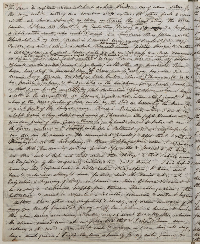 My first destination is Ghazeepore, where I have a letter to the magistrate. Mr Trench, a good artist, where also I want to see or hear of the manufacture of Rose--water & the stud of breeding troop of the Horses for a great part of the Bengal Army. Thence to Dinapore, where I am to see the opium works & a Dr Irving said to be a Botanist (& I sincerely hope he can tell me the name of the commonest plants). After that I shall arrive at Darjeeling by the originally intended time, end of March. I had hoped to have visited Rajmahal, a little below Bhagulpore, to have sent Ferns & Orchideae straight down for Kew, but the rains set in at Darjeeling in beginning of May, so I have no time to lose & I want to be sending a continual supply from thence. These will go down in the hot season & must be repacked in Calcutta, examined & sent on to England. Hitherto I have got on very comfortably & cheaply, only draw under £100 of the money you kindly forwarded for my use.