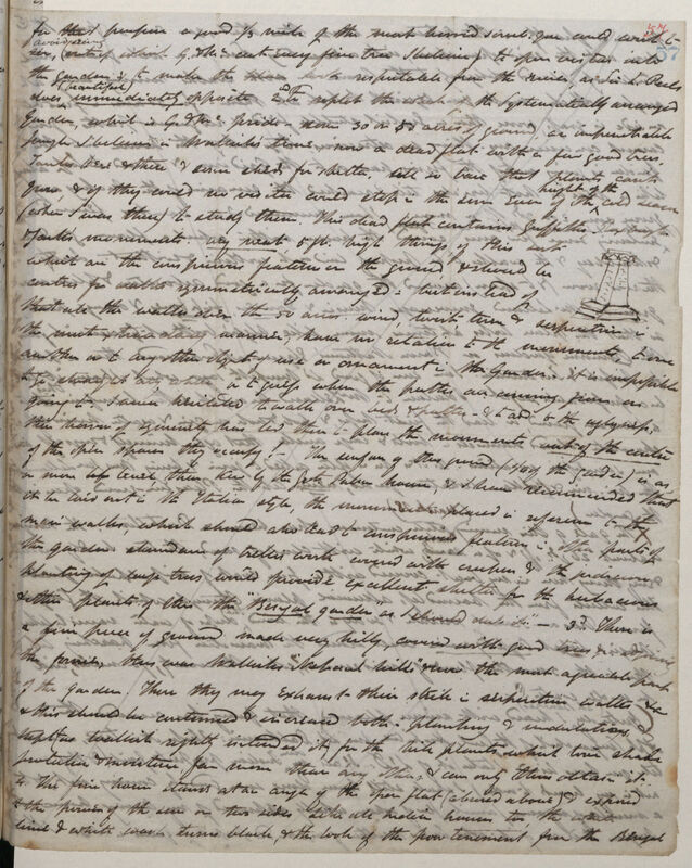 for that purpose a good 1/3 mile of the most horrid scrub you could wish to see avoid seeing (out of which G[riffith]. & McL[elland]. cut every fine tree I believe) to open vistas into the garden & to make the place look reputable from the river, as Sir L. Peels does (beautiful) immediately opposite. 2. To replot the whole of the systematically arranged Garden, which is G[riffith]. & Mc[Lelland]s pride -- some 30 or 50 acres of ground, an impenetrable jungle I believe in Wallich's time, now a dead flat with a few good trees. Tanks here & there & some sheds for shelter, all so bare that plants can't grow & if they could no visitor could stop in the sun even if the height of the cold season (when I was there) to study them. This dead flat contains Griffith's, Roxburgh's & Jack's monuments, very neat, 5 ft. high things, of this sort [a small sketch of a square, pedestal type monument appears here] which are the conspicuous features on the ground, & should be centres for walks systematically arranged -- but instead of that all the walks over the 50 acres, wind twist, turn & serpentine in the most extraordinary manner; have no relation to the monuments, to one another, or to any other object of use or ornament in the Garden, it is impossible to get straight anywhere or to guess where the paths are coming from or going to. I never hesitated to walk over beds & paths -- & to add to the uglyness[sic] their horror of symmetry has led them to place the monuments out of the centre of the open spaces they occupy! The surface of this ground (1/4 of the garden) is as or more level than Kew by the Great Palm house, & I have recommended that it be laid out in the Italia style, the monuments placed in reference to main walks, which should also lead to conspicuous features in other parts of the garden, abundance of trellis work covered with creepers & the judicious planting of large trees would provide excellent shelter for the herbaceous & other plants of this the "Bengal garden" as I should dub it. -- 3.d There is a fine piece of ground made very hilly, covered with good trees &c adjoining the former, this was Wallich's "Nepaul hills" & now the most agreeable part of the Garden. There they may exhaust their skill in serpentine walks &c & this should be continued & increased both in planting & undulating & kept (as Wallich rightly intended it) for the hill plants which love shade protection & moisture, far more than any others, & can only there obtain it. 4. The fine house stands at an angle of the open flat (abused above) & exposed to the power of the sun on two sides[.] Like all Indian houses too, the white lime & white wash turns black, & the look of the poor tenement from the Bengal