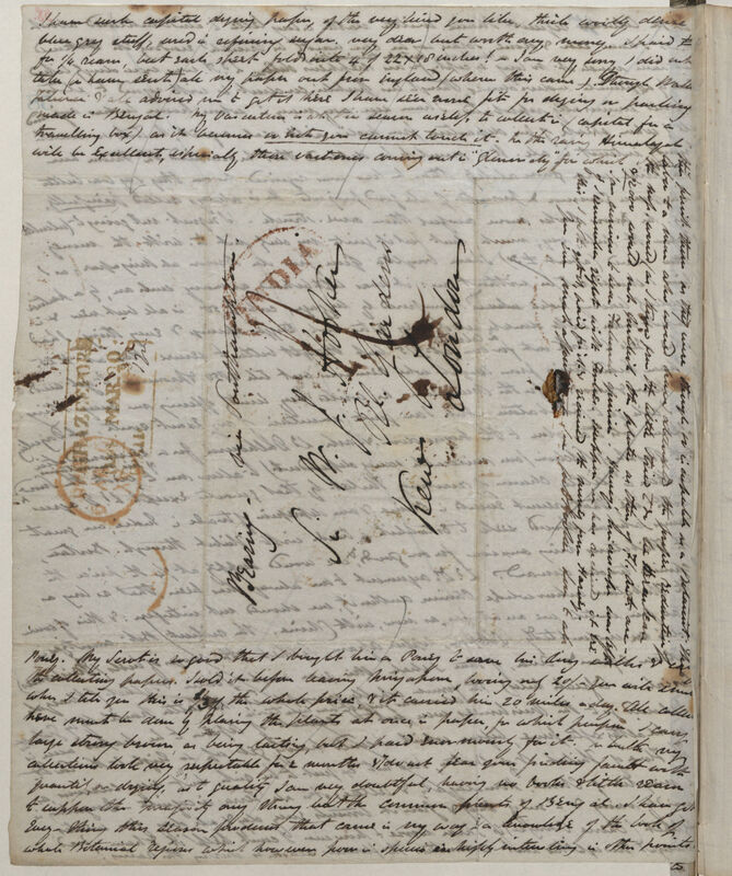 At the Colvilles request I have written rather a long letter to Lord Auckland about what I have seen & done, I daresay he can hardly be troubled reading it & should not have made it so long or dwelt upon certain trivialities, except for his nephews desire. Ld. A[uckland]. was exceedingly liked here by all private individuals, though his public conduct is with regard state affairs universally reprobated. I have seen very many in whose house he has sojourned all of whom speak of his departure from India with real regret, he took so much friendly interest in all. It is much to be deplored that he occupied the throne here at a time when more ability than he has was required. No one they say was better as a peace Governor & promoter of all good projects. He is always called painfully shy, he know looks more awful than awe--struck. I regret not going to Calcutta before the hills, very much, but feel it quite my duty not to. With the money thus saved (about £30) I have bought a Gun from Mr Brown at Mirzapore; as I find I should not be without one: it was left behind, as many such are, by a partner suddenly leaving India who is & hampered by luggage, cost £50, is all but new & in perfect order; with double sets of every extra tool, trigger--springs & every thing. I had asked Bell to look out for one in Calcutta at £15, but thought better to secure this at £25. I have heard twice from Wight who remains out till 1850 & promises to get seeds for Kew & woods &c for the museum -- he writes very kindly offering me every thing if I will go to Coimbatore. Still I am quite uncertain of my exact route, at Dorjeeling [Darjeeling] I have lots to do close to the house door, & I ask Ld Dalhousie for a recommendation to the Rajah of Sikkim (our miserable saucy dependent) t allow me to visit the snow of his mountains as there is little chance of reaching Thibet [Tibet] by that quarter except Ld. D[alhousie]. agrees with me, that recent events in China, & our depression of trade in India, are great causes why we should seek to establish a trade with Thibet through Bootan [Bhutan], the Thibetans being anxious for our goods & we would supply at 1/4 the price the Chinese traders demand. Ld. D[alhousie]'s argument to me always has been, that as long as the Thibetans acknowledge Chinese authority, we should not interfere: this of course is all fair until we are at war, as now, with China. The richest Bot[anical] countries in India are undoubtedly Sikkim, upper Assam, Sylhet & the ranges of hills (Mishmees) Cosiah or Cassiah hills) [Khasi Hills], the former wholly unexplored, the latter partially by Griffiths. I should go to the Mishmees where also Griffiths has been twice were not the climate of Assam to be to be passed over is unhealthy after June, before which I could hardly get up so high to the East[war]d[?]. The flora of Thibet N[orth] of Bootan, I do not expect to be rich, but very curious, as a mixture of China, Himalayah & Altai: it is all terra incognita -- Darjeeling is horridly rainy & in end of May & June it torrents every day & all day for weeks[.] Sylhet (Cheera Poonjee) [Cherrapunji] is I hear worse! however I can't help it & have had drought enough this last 2 months. The flowering season is during the rains!