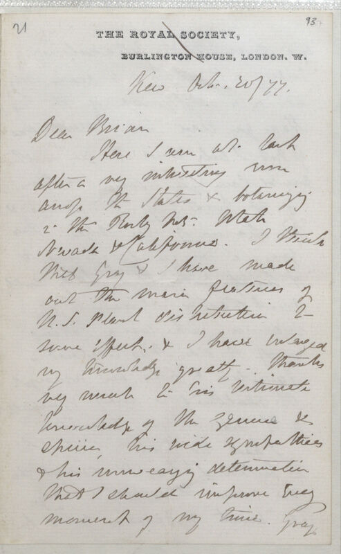 Here I am at last after a very interesting run across the States & botanizing in the Rocky M[ountain]s Utah Nevada & California. I think that Gray & I have made out the main features of the [North] S[outh] Plant distribution to some effect; & I have enlarged my knowledge greatly. Thanks very much to his intimate knowledge of the genera & species, his wide sympathies & his unwearying determination that I should improve every moment of my time. Gray