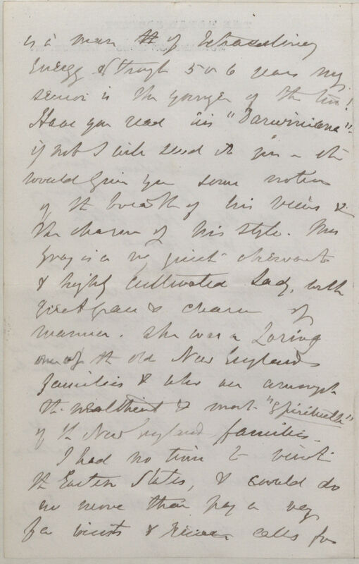 is a man th of extraordinary energy although 5 or 6 years my senior is the younger of the two! Have you read his "Darwiniana"? if not I will send it you as this would give you some notion of the breadth of his views & the charm of his style. Mrs Gray is a very quiet observant & highly cultivated lady, with quiet grace & charm of manner. She was a Loring, one of the old New England families & who are amongst the wealthiest & most "spirituelle" of the New England families.