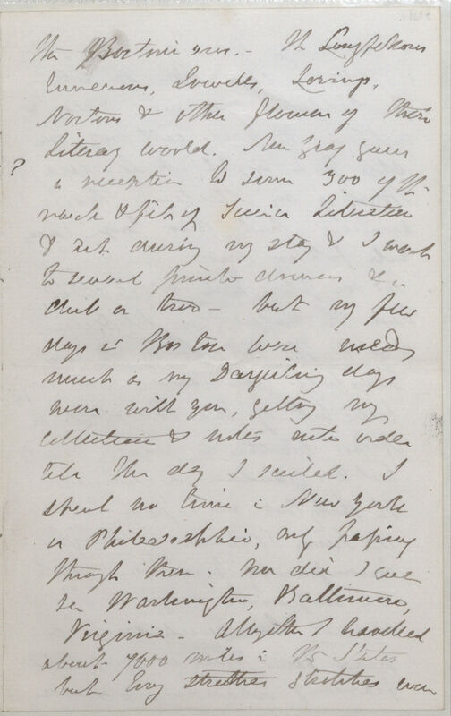 the Bostonians. The Longfellows, Emersons, Lowells, Lorings, Nortons & other flowers of their literary world. Mrs[?] Gray gave a reception to some 300 of the rank & file of Science Literature & Art during my stay & I went to several private dinners & a club or two -- but my few days in Boston were used much as my Darjeeling days were with you, getting my collection & notes into order till the the day I sailed. I spent no time in New York or Philadelphia, only passing through them. Nor did I even see Washington, Baltimore, Virginia. Altogether I travelled about 7000 miles in 15 States but long strethes stretches were