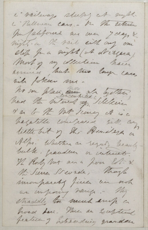 No one place can nor all together had the interest of concentrated in Sikkim & as to the M[ountain] scenery it is a bagatelle compared with any little bit of the Himalayas or Alps. Whether as regards beauty -- bulk, grandeur or interest. The Rocky M[ountains] are a poor sub[stitute] & the Sierra Nevada, though incomparably finer are not an imposing range. -- they straddle too much across a broad base. There are exceptional features of Extraordinary grandeur
