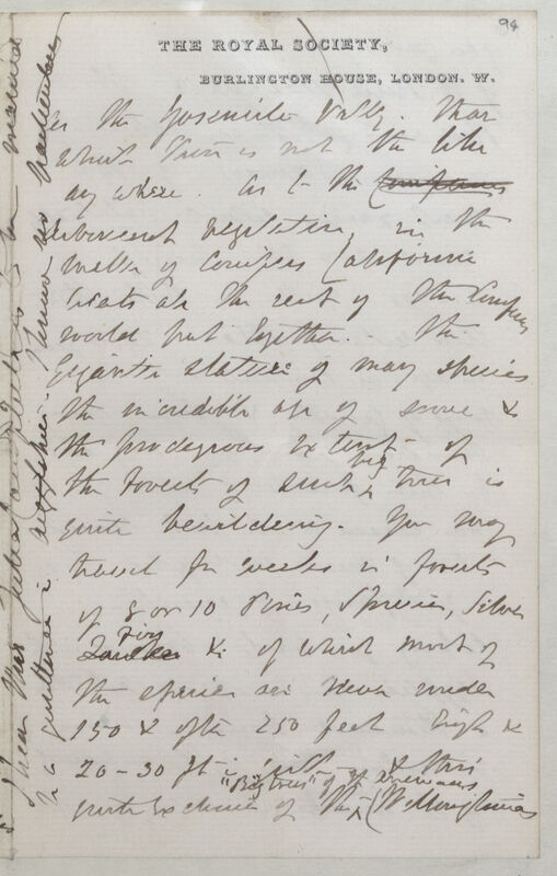 as the Yosemite Valley. That which there is not the like any where. As to the Coniferous arborescent vegetation, in the matter of conifers California beats all the rest of the coniferous world put together. The gigantic stature of many species is the incredible age of some & the prodigious extent of the forests of such big trees is quite bewildering. You may travel for weeks in forests of some 8 or 10 Pines, Spruces, Silver Landles Firs &c of which most of the species are never under 150 & often 250 feet high & 20 -- 30 ft in girth & this quite exclusive of the "Big trees" of the Americas (Welllingtonia