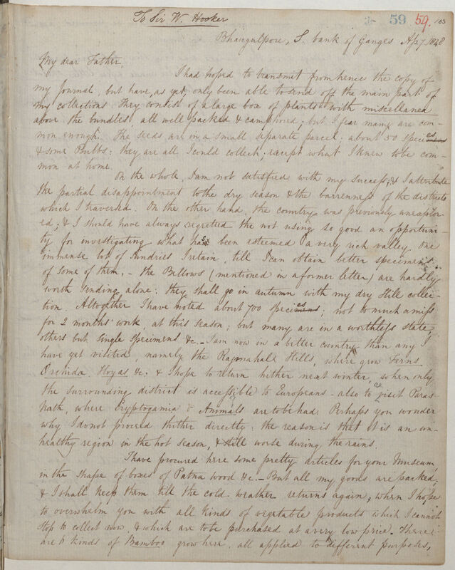 JDH summarises the collection he has sent home. Now in Rajmahal Hills amongst Ferns, Orchids & Hoyas. In winter he will return to Rajmahal & Parasnath for Cryptogamia & animals. He has boxes of Patna wood for the Kew museum & will get more items. JDH met Dr Gordon at Mirzapore, Fred Thomson at Benare & Wallace, Trench & others at Ghazeepore, where he saw rose garden & manufacture of rose water & Attar. At Dinapore [Danapur] missed Captain Hemchman but met Captain Doria. At Patna stayed with Irvine who went with WJH to Slaffa & collected Fucus balticus; visited the opium factory & got a set of their tools; met a son of Admiral Beaufort & through him heard of Mrs L.P. Wilson’s death. In India JDH is known from James Clark Ross's account of their voyage. Thanked Lord Dalhousie for appointing Gurney. At Morghyr he & Dr Hastings visited hot springs where they worship the Confervae, could not collect them as at Sarroukbund. At Bhungalpore [Bhagalpur] staying with Grant & Raikes, has met Clergyman Vaux & written account of Major Napleton's horticultural garden for JOURNAL OF BOTANY, the curator is named Ross. Mr Pontel cultivates flowers & has given JDH a bamboo & Bauhinia bark bow with reed arrows. JDH will return for mineral & fossil woods for Henry de la Beche. Will travel via Purnah & Titalyah. Enumerates his expenses. He has recommended the Governor protect timber trees like Walnut & Sal. Mentions poor state of materia medica & science in India. Writing from Colgong [Kahalgaon] 8 Apr adds he met Mr Alexander & is staying at an Indigo planter's house overlooking the Ganges & a landscape of Casuarina, mango groves, Tamarind milia, Ficus religiosa or 'Peepul', Borassus, Phoenix, sand flats & distant Himalayas. He anticipates luxuriant flora at Darjeeling. JDH prefers up-country India to Calcutta [Kolkata]. Mentions Thomas Thomson, Vicary, MacIvor in Madras [Chennai], Brewster's article in the N. BRITISH REVIEW, Lord Morpeth, Mr Phillippe, Lord Auckland, Lawrence Peel.