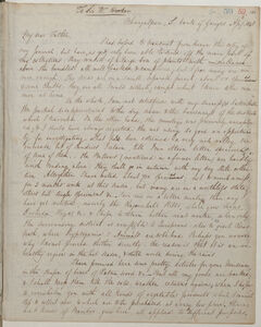 My dear Father, I had to discontinue writing yesterday, that I might dine with the Judge, a Mr. Alexander, whose wife is the daughter of Gen[era]l. Doveton, Governor of St Helena, a friend of the Grevilles & of Darwin, & niece, I think of Miss Haldane. I am awaiting the Boat which brings my Palkee, having travelled