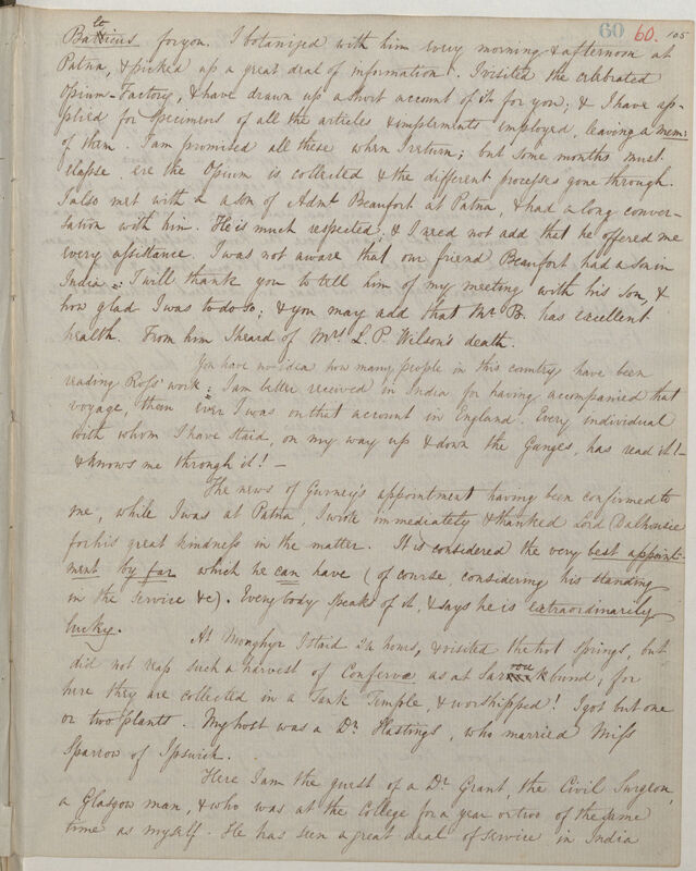 Batllticus for you. I botanized with him every morning & afternoon at Patna, & picked up a great deal of information. I visited the celebrated Opium--Factory, & have drawn up a short account of it for you; & I have applied for specimens of all the articles & implements employed, leaving a mem: of them. I am promised all these when I return; but some months must elapse ere the opium is collected & the different processes gone through. I also met with a a[sic] son of Adm[ira]l. Beaufort at Patna, & had a long conversation with him. He is much respected; & I need not add that he offered me every assistance. I was not aware that our friend Beaufort had a son in India: I will thank you to tell him of my meeting with his son, & how glad I was to do so; & you may add that Mr. B. has excellent health. From him I heard of Mrs. L.P.Wilson's death.