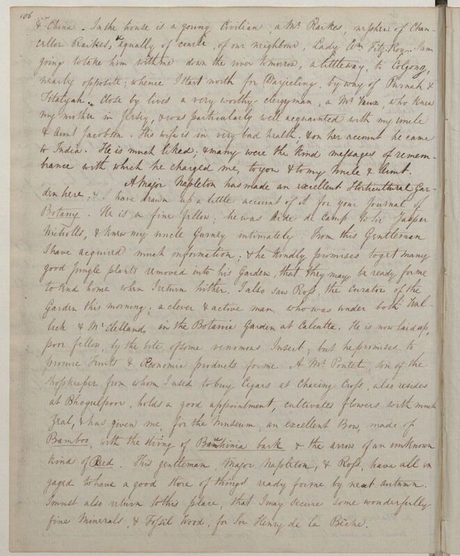 A Major Napleton has made an excellent Horticultural Garden here; & I have drawn up a little account of it for your Journal of Botany. He is a fine fellow; he was Aide de Camp to Sir Jasper Nicholls, & knew my Uncle Gurney intimately. From this Gentleman I have acquired much information; & he kindly promises to get many good Jungle plants removed into his Garden, that they may be ready for me to send home when I return hither. I also saw Ross, the Curator of the Garden this morning; a clever & active man, who was under both Wallich & McClelland in the Botanic Garden at Calcutta. He is now laid up, poor fellow, by the bite of some venomous Insect, but he promises to procure Fruits & Economic products for me. A Mr. Pontel, son of the shopkeeper from whom I used to buy Cigars at Charing Cross, also resides at Bhogulpoor [Bhagalpur], holds a good appointment, cultivates flowers with much zeal, & has given me, for the museum, an excellent Bow, made of Bamboo, with the string of Banuhinia bark & the arrow of an unknown kind of Reed. This gentleman, Major Napleton, & Ross, have all engaged to have a good store of things ready for me by next autumn. I must also return to this place, that I may secure some wonderfully fine minerals, & Fossil Wood, for Sir Henry de la Beche.