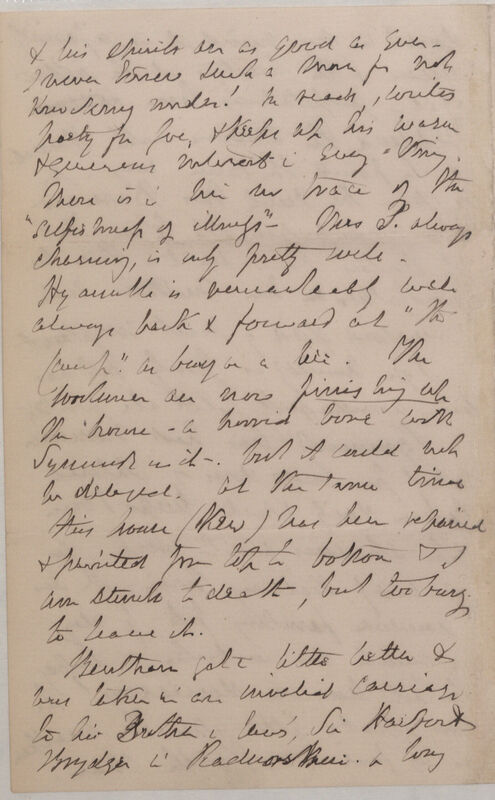 & his spirits are as good as ever -- I never knew such a man for not knocking[?] under! He reads, writes poetry for Joe *8, & keeps up his warm & generous interest in every thing. There is in him no trace of the "selfishness of illness" -- Mrs S[ymonds] always charming, is only pretty well.