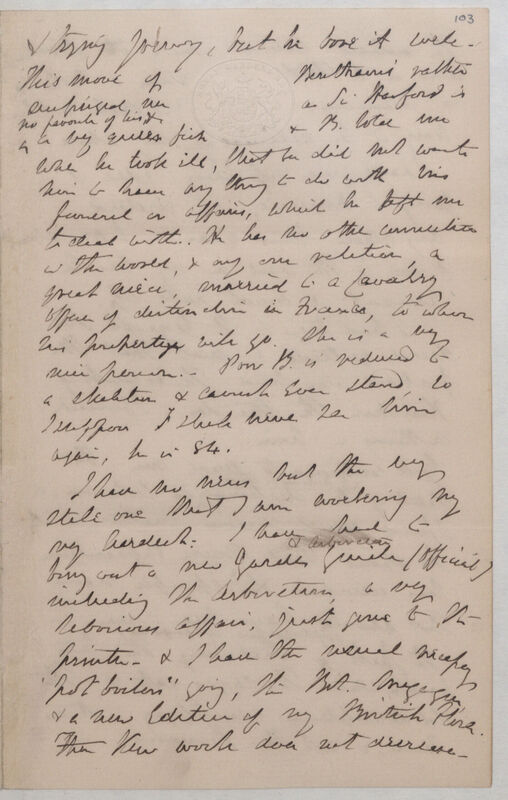& trying journey, but he bore it well. This move of Bentham’s rather surprised me as Sir Harford is no favourite of his & a very queer fish & B[entham] told me when he took ill, that he did not want him to have anything to do with his funeral or affairs, which he left me to deal with. He has no other connections in the world, & only one relation, a great niece married to a Cavalry officer of distinction in France, to whom his property will go. She is a very nice person. Poor B[entham] is reduced to a skeleton & cannot even stand, so I suppose I shall never see him again, he is 84.