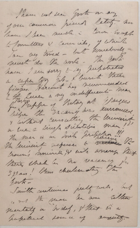 I have not seen Grote *15 or any of our common friends lately nor have I been much in town except to Committees & Councils, of which I am very tired -- but somebody must do the work. The Gov[ernmen]t have I am sorry to say perpetuated a super tory[?] job -- & burnt their fingers. Harcourt *16 has recommended to the Queen a very indifferent man for Regius Professor of Botany at Glasgow before the vacancy was announced & without consulting the University, or even a single scientific man! The man is an Irish professor!!! The University refuses to receives receive the Crown's nominee, & will arrange that there shall be no vacancy for 3 years! thus checkmating the Gov[ernmen]t.