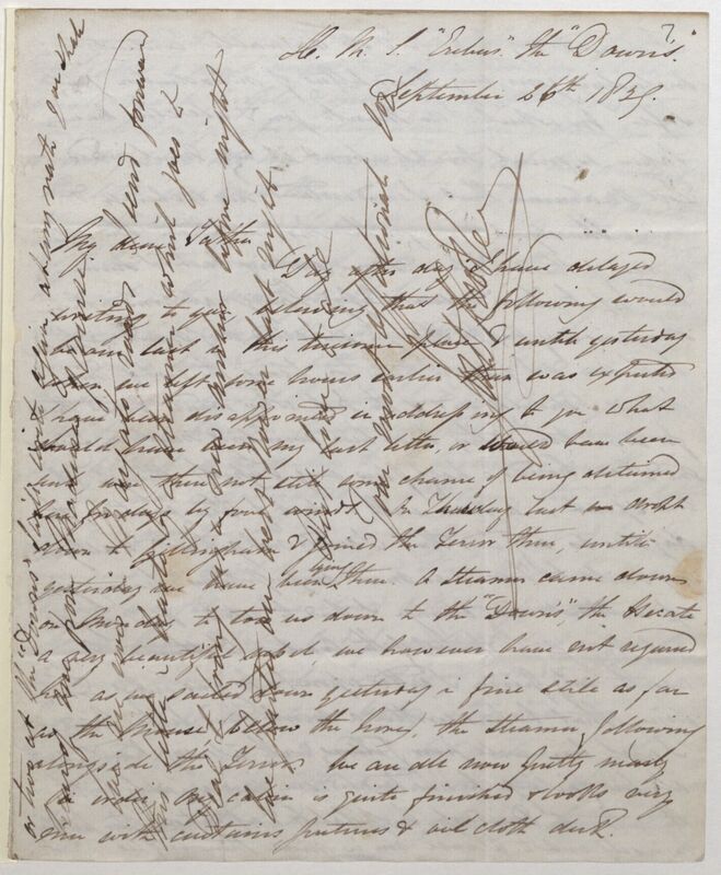 Day after day I have delayed writing to you believing that the following would be our last in this tiresome place & until yesterday when we left some hours earlier than was expected I have been disappointed in addressing to you what should have been my last letter, or would have been such were there not still some chance of being detained here for days by foul winds. On Thursday last we dropt[sic] down to Billingham & joined the Terror there, until yesterday we have been lying there. A steamer came down on Monday to take us down to the "Downs", the Hecate a very beautiful vessel, we however have not rejoined her as we sailed down yesterday in fine stile[sic] as far as the Manse[?] (below the Nore), the steamer following alongside the Terror. We are all now pretty nearly in order. My cabin is quite finished & looks very nice with curtains, pictures & oil cloth desk.