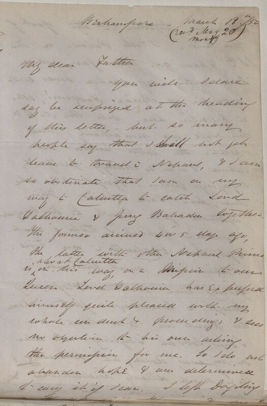 You will I dare say be surprised at the heading of this letter, but so many people say that I shall not get leave to travel in Nepaul [Nepal], & I am so obstinate that I am on my way to Calcutta *2 to catch Lord Dalhousie & Jung Bahadur together. The former arrived 4 or 5 days ago, the latter with other Nepaul Princes is also at Calcutta on his way, on a mission to our Queen. Lord Dalhousie has expressed himself quite pleased with my whole conduct & proceedings & sees no objection to his own asking for permission for me. So I do not abandon hope & am determined to carry it if I can. I left Dorjiling [Darjeeling] on the 14th with Thomson & we