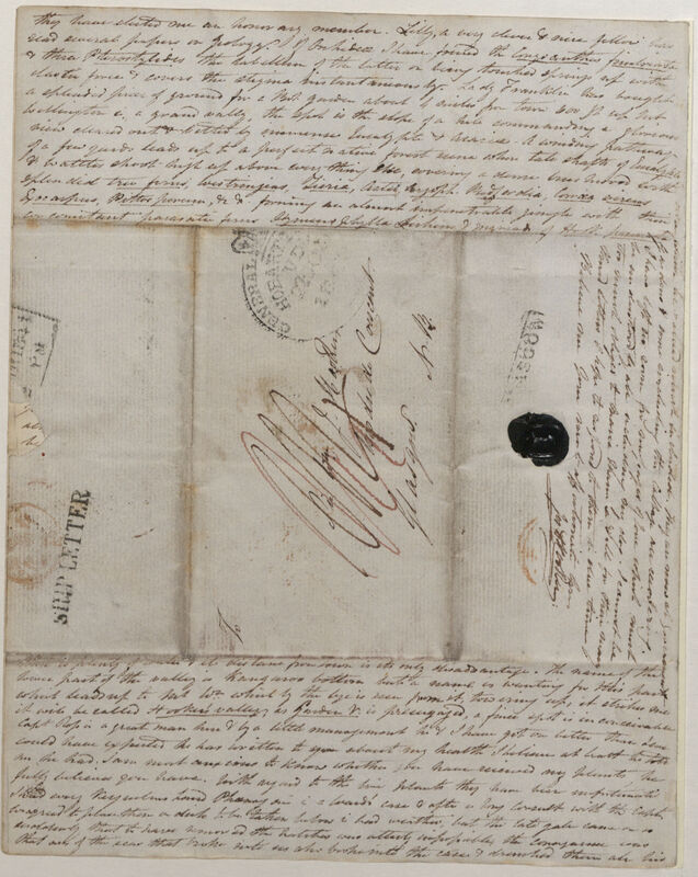 Sir John and Lady Franklin have invited me 4 or 5 times to Government house. I have been there twice they are extremely kind the much so in one instance lately where her Lady ship[sic] arranged that with Capt[ain]. Ross that I should go for a week all over the Island on horseback with her Aide de Camp Lieut[enant] Bagot*9 (son of the bishop of Oxford*10) going to Launceston & returning by Oyster bay to the Eastward with servants &c. As this did not suit my collecting propensities I called on her Lady ship[sic] & respectfully declined what might have else been a most pleasant trip. Kaye[sic] has gone & fine weather they have had! I have a nice poney[sic] from Lady F[ranklin]. on which I sometimes ride to my Botanizing stations along with a clever man from Mr Gunn's [.] Cryptogramica of course form the best part of my collections hitherto