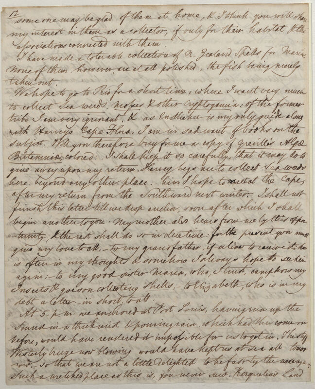 We hope to go to Rio for a short time, where I want very much to collect Sea weeds, Mosses & other Cryptogamia: of the former tribe I am very ignorant & as Endlicher is my only guide along with Harvey[']s Cape Flora, I am in sad want of books on the subject. Will you therefore buy for me a copy of Greville's Alga Britannia colored: I shall keep it so carefully that it may do to give away upon my return. Harvey begs me to collect Seaweeds here beyond any other place: him I hope to meet at the Cape, after my return from the Southward next winter. I shall not finish this letter till we drop anchor, soon after which I shall begin another to you. My mother also hears from me by this opportunity, & the rest shall do so in due time: for the present you must give my love to all, -- To my grandfather, if alive to receive it; he is often in my thoughts & somehow I always hope to see him again:-- to my good sister Maria, who, I trust, camphors my Insects & goes on collecting Shells,-- to Elizabeth, who is in my debt a letter:-- in short to all.