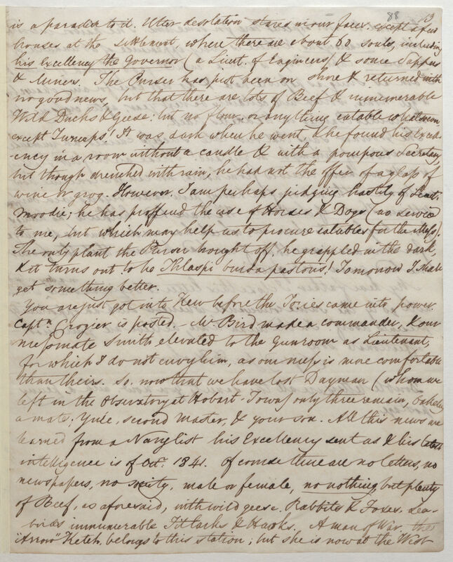 You are just got into Kew before the Tories came into power. Capt[ai]n Crozier is posted -- Mr Bird made a commander, & our messmate Smith elevated to the Gunroom as Lieutenant, for which I do not envy him, as our mess is more comfortable than theirs. So, now that we have lost Dayman (whom we left in the Observatory at Hobart Town) only three remain, Oakeley a mate, Yule, second Master, & your son. All this news are learned from a Navy list his Excellency sent us & his latest intelligence is of Oct[obe]r 1841. Of course there are no letters, no newspapers, no society, male or female, no nothing, but plenty of Beef, as aforesaid, with wild geese, Rabbits & Foxes, Seabirds innumerable Titlarks & Hawks. A Man of War, the "Arrow" Ketch, belongs to this station, but she is now at the West