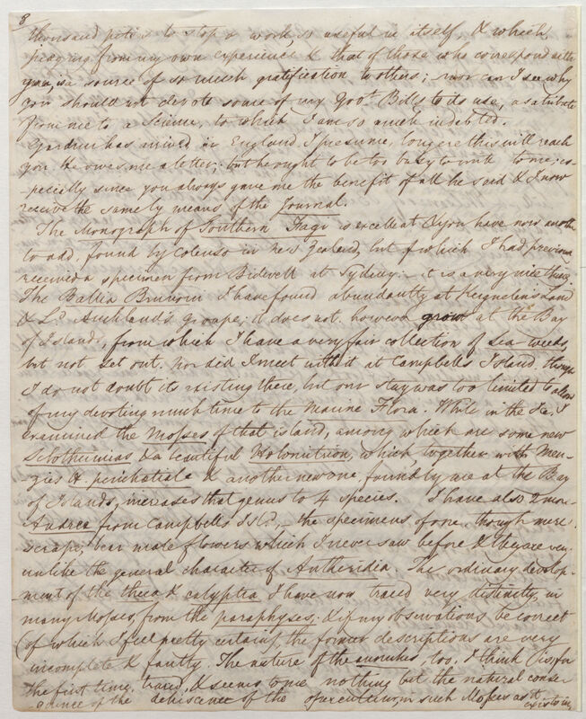 The Monograph of Southern Fragi is excellent & you have now another to add, found by Colenso in New Zealand, but of which I had previously received a specimen from Bidwell at Sydney:-- it is a very nice thing. The Ballia Brunoni I have found abundantly at Kerguelen's Land & L[ord]d Auckland's Groupe[sic]; it does not however grow at the Bay of Islands, from which I have a very fair collection of Sea--weeds, but not set out. Nor did I meet with it at Campbells Island, though I do not doubt its existing there, but our stay was too limited to allow of my devoting much time to the Marine Flora. While in the Ice, I examined the Mosses of that island, among which are some new Sclotheimias & a beautiful Holomitrion[?], which, together with Menzies H. perichaetiale & another new one, found by me at the Bay of Islands, increases that genus to 4 species. I have also 2 more Andreaea from Campbells Isl[an]d, -- the specimens of one, though mere scraps, bear male flowers which I never saw before & they are very unlike the general character of Antheridia. The ordinary development of the theca & calyptra I have now traced very distinctly, in many Mosses, from the paraphyses, & if my observations be correct (of which I feel pretty certain), the former descriptions are very incomplete & faulty. The nature of the auricles[?], too, I think is, for the first time, traced, & seems to me nothing but the natural consequence of the dehiscence of theoperculum, in such Mosses as it exists in,