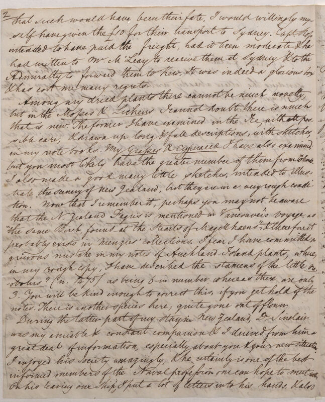 During the latter part of my stay in New Zealand, Dr. Sinclair was my amiable & constant companion, especially about you & your new situation. I enjoyed his society amazingly, & he certainly is one of the best informed members of the Naval profession one can hope to meet with. On his leaving our ship, I put a lot of letters into his hands, & also