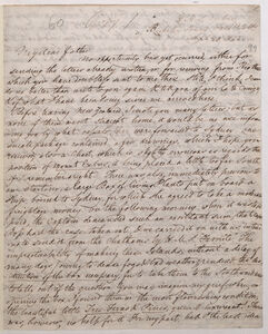 May 3d -- My dear father: Since writing the above, I have been away on a cruize[sic] to the other side of the Island, with all the hunting party. Now on my return, the "Arrow" is about to sail for Rio, and there will not be time for me to give you the promised account of our late Cruize[sic] to the Southward. By this opportunity, letters go from me, addressed to you, my mother & Liz, at Kew: also to aunt Palgrave, Bentham, Mr. Dalton & Mrs. Boott (the 2 last are part inside of this for you, postage being nothing & I forget their addresses) Had [I] not been away, I sh[oul]d also have written to my long neglected friend at