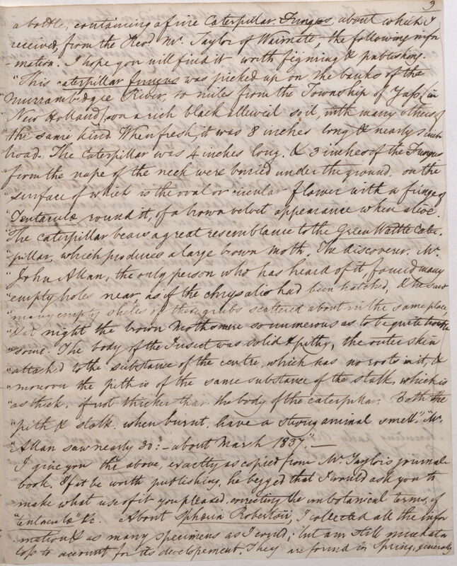 a bottle, containing a fine Caterpillar Fungus, about which I received, from the Rev[eren]d Mr. Taylor of Waimate, the following information. I hope you will find it worth figuring & publishing. "This caterpillar fungus was picked up on the banks of the Murrambidgee [Murrumbidgee] River, 10 miles from the Township of Yass (in New Holland), on a rich black alluvial soil, with many others of the same kind. When fresh, it was 8 inches long & nearly 1 inch broad. The caterpillar was 4 inches long & 3 inches of the Fungus from the nape of the neck were buried under the ground, on the surface of which is the oval or circular flower with a fringe of Tentaculae round it, of a brown velvet appearance when alive. The caterpillar bears a great resemblance to the Green Wattle caterpillar, which produces a large brown moth. The discoverer Mr. John Allan, the only person who has heard of it, found many empty holes near, as if the chrysalis had been hatched, & he saw many empty shells of these grubs scattered about in the same place, & at night the brown moths were so numerous as to be quite troublesome. The body of the Insect was solid & pithy, the outer skin attached to the substance of the centre, which has no roots in it, & moreover the pith is of the same substance of the stalk, which is as thick, if not thicker than the body of the caterpillar. Both the pith & stalk when burnt have a strong animal smell". "Mr. Allan saw nearly 30: -- about March 1837". --