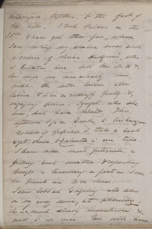 botanized together to the foot of the hills. I took palkee on the 15th & have got this far, where I am resting my shaken bones with a cousin of Brian Hodgson's, who is Collector here, both his self & his wife are remarkably nice people. The latter knows Mrs Sabrine & is an exceedingly pretty & engaging person. I forget who she was, but have heard. This afternoon I go on Dawk to Kishnagur whence if possible I take a boat & get down to Calcutta in one tide. I have been most fortunate in getting cool weather & refreshing breezes. -- travelling as fast as I can no plants are to be had.