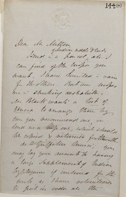 stupendous collections at the India House, which include all Griffiths, & (and) if you are inclined to undertake the Cryptogams I will send them you for the purpose. I do not intend to let these interfere with my own Indian Herb[ariu]m as I offer my services gratis &c (et cetera) -- but if I publish any thing about them I shall do it as a supplement. This will not be for some time however, & (and) meanwhile I would not delay sending what you have done to Linnean Journal.