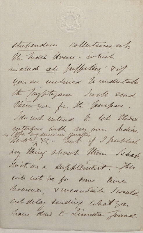 stupendous collections at the India House, which include all Griffiths, & (and) if you are inclined to undertake the Cryptogams I will send them you for the purpose. I do not intend to let these interfere with my own Indian Herb[ariu]m as I offer my services gratis &c (et cetera) -- but if I publish any thing about them I shall do it as a supplement. This will not be for some time however, & (and) meanwhile I would not delay sending what you have done to Linnean Journal.