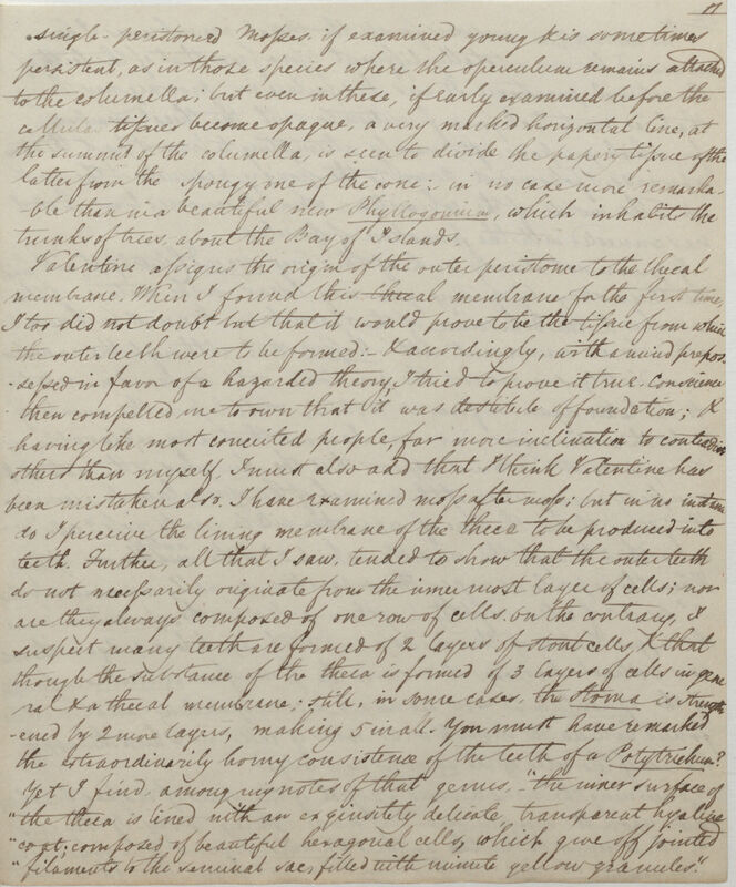 I do not at all understand Valentine's description of the origins of the Peristone. At p[age] 470 line 18, he describes the outer peristome, as being formed of the inner layers of the operculum; & again (p[age] 471, line 3) he says "it is attached to the inner lining of the theca or thecal membrane, with which it is continuous at the base". Again, speaking of the inner peristome, (at p[age] 470, line 25,) it is formed out of the opercular membrane; but (p[age] 471, line 19) it is said to be continuous with the columellar membrane