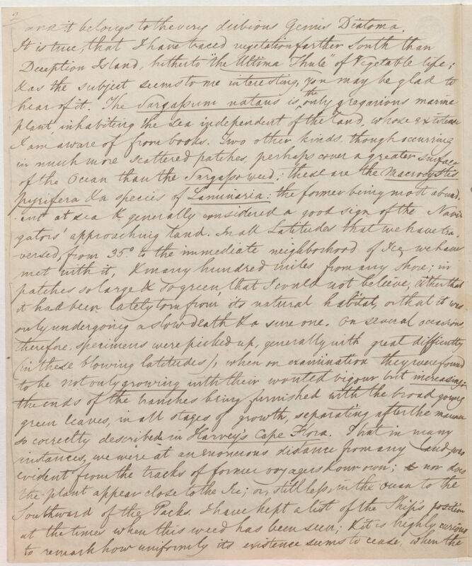 and it belongs to the very dubious Genus Diatoma. It is true, that I have traced vegetation farther South than Deception Island, hitherto “the Ultima Thule” *3 of Vegetable life; & as the subject seems to me interesting, you may be glad to hear of it. The Sargassum natans is the only gregarious marine plant, inhabiting the sea independent of the land, whose existence I am aware of from books. Two other kinds, though occurring in much more scattered patches, perhaps cover a greater surface of the Ocean than the Sargasso weed: these are the Macrocystis pyrifera & a species of Laminaria: the former being most abundant at sea & generally considered a good sign of the Navigators’ approaching land. In all Latitudes that we have traversed, from 35° to the immediate neighborhood of Ice, we have met with it, & many hundred miles from any shore; in patches so large & so green, that I could not believe, either that it had been lately torn from its natural habitat, or that it was only undergoing a slow death & a sure one. On several occasions, therefore, specimens were picked up, generally with great difficulty (in these blowing latitudes), when on examination they were found to be not only growing with their wonted vigour but increasing; the end of the branches being furnished with the broad young green leaves, in all the stages of growth, separating after the manner so correctly described in Harvey's Cape Flora. That in many instances, we were at an enormous distance from any land, was evident from the tracks of former voyages & our own; & nor does the plant appear close to the Ice; or, still less, in the ocean to the Southward of the Packs. I have kept a list of the ship's position at the times when this weed has been seen; & it is highly curious to remark how uniformly its existence seems to cease when the