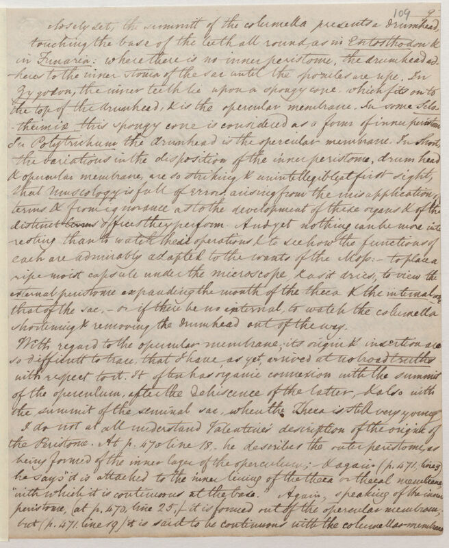 I do not at all understand Valentine's description of the origins of the Peristone. At p[age] 470 line 18, he describes the outer peristome, as being formed of the inner layers of the operculum; & again (p[age] 471, line 3) he says "it is attached to the inner lining of the theca or thecal membrane, with which it is continuous at the base". Again, speaking of the inner peristome, (at p[age] 470, line 25,) it is formed out of the opercular membrane; but (p[age] 471, line 19) it is said to be continuous with the columellar membrane