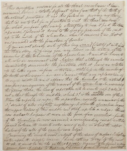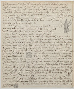The 2nd Moss was a Sphagnum in which I can see very clearly what is meant by the spinal vessels of the cellular tissue; but cannot agree with any views which sanction such a name. [Two sketches appear here] *11 To me it appears that the cells are divided by horizontal, or, more seldom, by oblique septa, into partitions. If you examine one of the perichetial leaves which are exceedingly thin & membranous, with a low flower[?], it seems composed of lozenge-shaped cells. Apply a rather higher lens, & each cell is seen to be crossed by 2 or more oblique parallel lines, which are of precisely the same apparent substance & texture as the walls themselves of the cells [A sketch appears in the middle of the sentence, it occupies the next three lines] but rather more slender[.] Now, if we suppose these cells to be inflated; -- or in other words, that the perichetial leaf be rendered as thick as a cauline one, it will follow that we shall see two of the minor lines for everyone that was seen before: one being the junction of the same septum to the opposite wall of the cell: -- hence the flat compressed cell of the perichetial leaf resembles this [a sketch appears here]; but the inflated one of the cauline leaf this [a sketch appears here]; or if the septa are oblique [a sketch appears here]. Now will you be kind enough to examine the leaf of a Sphagnum & tell me if the oblique lines are not rare & if ever you see the lines, forming a true spire in the cell. In some young leaves, the very walls of the cells containing cavities or cells look beaded [a sketch appears here].