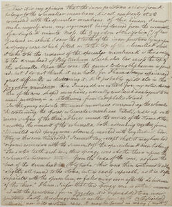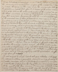 July 21st I have been carrying out the above subjects, particularly with reference to the thecal membranes; & I now suspect that the spongy cone of orthotrichum is similar to the peduncle of the seminal sac. I have examined a ripe Voitia with very great care & find from a beautiful dissection, performed with extreme trouble, that the inner membrane of the theca (thecal membrane, Val[entine]) forms the peduncle of the sac, the lining of the theca, & lastly, descending from the apex of the theca constitutes the long bristle--shaped cone, described by Brown (Parry's Voyage), & by means of a fine network of beaded cells, similar to those ramifying from the theca to the sac, it communicates, again, with the peduncle of the sac. It thus passes right through the columella; whose membranae I distinctly perceive to be continuous with that of the sac, both above & below.