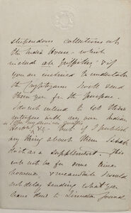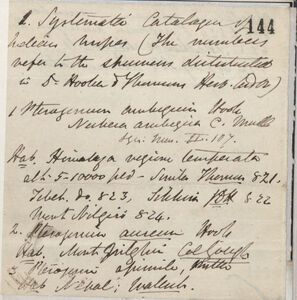 stupendous collections at the India House, which include all Griffiths, & (and) if you are inclined to undertake the Cryptogams I will send them you for the purpose. I do not intend to let these interfere with my own Indian Herb[ariu]m as I offer my services gratis &c (et cetera) -- but if I publish any thing about them I shall do it as a supplement. This will not be for some time however, & (and) meanwhile I would not delay sending what you have done to Linnean Journal.
