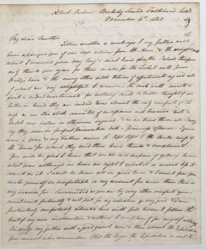 Letters written a week ago to my father will have apprized you of our safe return from the Horn & the delight with which I received your very long & most kind epistles I shall therefore only thank you again for them as also for the locket with poor Willy's*1 hair & the many other little tokens of affectionate regard all of which are very delightful to receive.-- The cask with carrots & fruit is indeed inestimable for nothing could be better thought of or better in kind. They are indeed now almost the only comforts of the mess as our Rio [de Janeiro] stock consisted of necessaries not luxuries: not a bottle was broken or otherwise injured & as we tried them all! may say they were in perfect preservation both in firmness & flavour. I gave some in your & my Father's name to Capt. Ross & the mates mess of the "Terror" for which they send their kind thanks & compliments. You will be glad to hear that we do not despair of getting home next year although we have no right to expect it or much less to count on it. I shall be home all in good time & I much fear you make yourself uncomfortable on my account far more than there is any occasion for -- surrounded as you are by every other comfort you must wait patiently & not fret for my situation is very good & I am particularly comfortably situated here with full license to follow the beat of my own inclination & nothing to complain of for myself although I indulge my father with a good growl now & then about the Expedition you must also remember that the longer the Expedition is out the