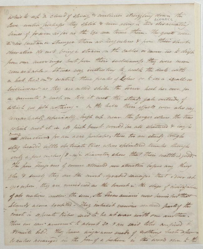 whisk up a cloud of spray & continue struggling down the cove until perhaps they split & run away in two disavicating divaric *5 lines of foam as far as the eye can trace them. The gusts were in no instance stronger than at Kerguelens & from their short duration do not bring a strain on the cables or cause us to drift from our moorings but from their suddenness they were more remarkable -- it was very interesting to walk the deck with a hat tied on & watch these freaks of Aeolus*6 or to see a squall or williewaw as they are called strike the Terror[,] keel her over for a minute & rush on till it met the steady gale outside, of which we felt nothing -- on the hills their effects were also very remarkable especially high up near the gorges where the trees which met it in its first burst would be all shattered & lay in every direction for an acre perhaps, these there too are sturdy tough stag headed little obstinate trees whose splintered trunks though only a few inches (8-14) in diameter, show that their mettle is good. The poor Fuegians of course attracted our attention before anything else & surely they are the most degraded savages that I ever set eyes upon, they are considered as the lowest in the stage of civilisation of all nations under the sun, the Tasmanians now banished that Island alone accepted -- They inhabit various scattered parts of the coast in separate tribes said to be at war with one another. These we saw amount to be about 20 & are said to be confined to Hermite Isl[an]d. They have wigwams made of nothing but a few branches arranged in the form of a beehive in the wood close to the