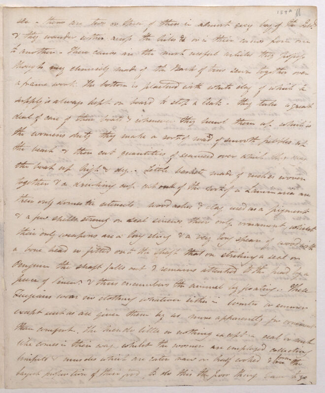 sea -- there are two or three of these in almost every bay of the [Isl[an]ds. & they wander either across the hills or in their canos[sic] from one to another. These canos are the most useful articles they possess though very clumsily made of the bark of trees sewn together over a frame work the bottom is plastered with white clay of which a supply is always kept on board to stop a leak -- they take a great deal of care of these boats & whenever they hawl[sic] them up which is the womens['] duty they make a sort of road of smooth pebbles up the beach & then cut quantities of seaweed over which they drag the boat up high & dry. Little baskets made up of rushes woven together & a drinking cup cut out of the root of a Laminaria are their only domestic utensils, wood ashes & clay used as a pigment & a few shells strung on seal sinew is their only ornament, whilst their only weapons are a long sling & a very long spear of wood with a bone head so fitted on to the shaft that on striking a seal or penguin the shaft falls out & remains attached to the head by a piece of sinew & this encumbers the animal by floating. These Fuegians wear no clothing whatever either in winter or summer except such as are given them by us more apparently for ornament than comfort. The men do little or nothing except seal or such like comes in their way whilst the women are employed collecting limpets & muscles which eaten raw or half cooked & form the largest proportion of their food, to do this the poor things have to go