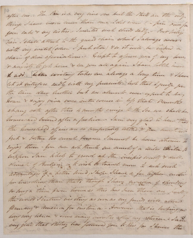 better it is for me as long as my time is well employed & there is little chance of want of work in this ship if I could only do it better. I often think of the nice house & garden of which it is easy to form a good idea from the excellent sketches Fitch has done & indeed until they arrived for nearly 1/2 year I continued to wonder & wonder what sort of a spot you inhabited -- Being near Aunt Palgrave is also a great comfort to you & so is a country life which you always liked so much better than one in town. After all I am sorry to leave Glasgow not so much for that I liked the place or its inhabitants but the near neighbourhood of the Highlands will be a great desideratum. The advantages of the present situation are immense in every way & Glasgow had none of them. The garden must be delightful & very little expense I should hope as Kew will supply all the necessaries -- Unfortunately we have no map of the shire here so that I could not lay my finger on the spot were I to see one until I work out its Lat[itude]. & long[itude]. by your letters. I intended long ere this to have written again to Mr Arnott to condole with him on the loss of the chair which he & he only received. Balfour is an old friend of mine & was a most kind one -- I remember once sleeping under the same blanket with him on the ground in Isla during a bitter cold night when all the poor fellows anxiety was to keep me warm & I had to pretend to go to sleep before he ever attempted it. So I must write to him too & stir him up to study Botany now & drop medicine. The Ass[istan]t. Surgeon of the Carysfort told me that the College was quite at a stand still & that the new appointments &c had given general dissatisfaction. London is certainly getting far ahead of it & Edinburgh always was