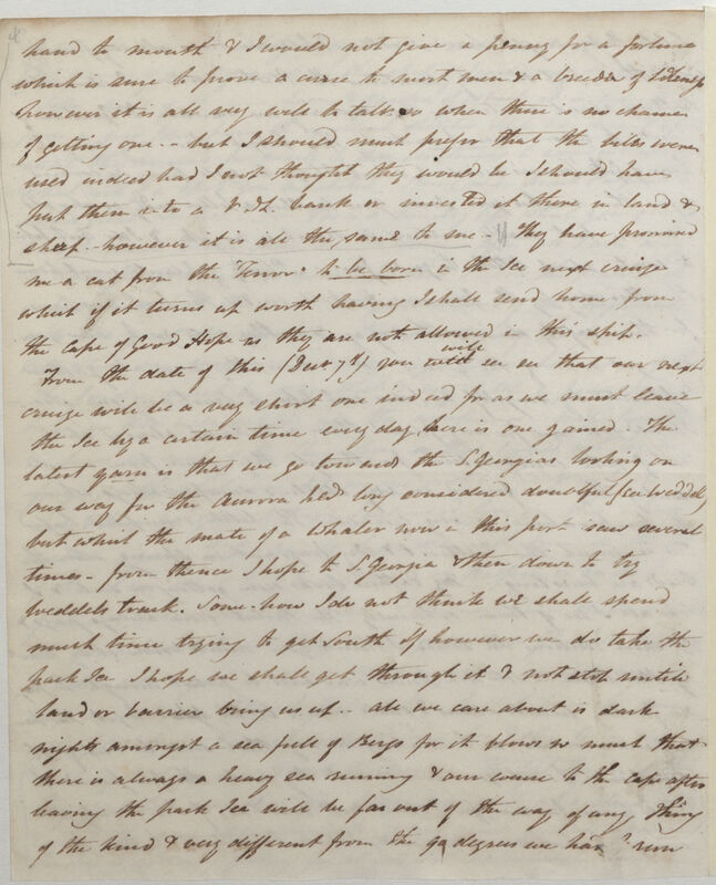 hand to mouth & I would not give a penny for a fortune which is sure to prove a curse to most men & a breeder of idleness. However it is all very well to talk so when there is no chance of getting one -- but I should much prefer that the bills were used indeed had I not thought they would be I should have put them into a V[an]. D[iemen's]. L[and]. bank or invested it there in land & sheep -- however it is all the same to me. They have promised me a cat from the 'Terror' to be born in the ice next cruize[sic] which it if turns up worth having I shall send home from the Cape of Good Hope as they are not allowed in this ship.