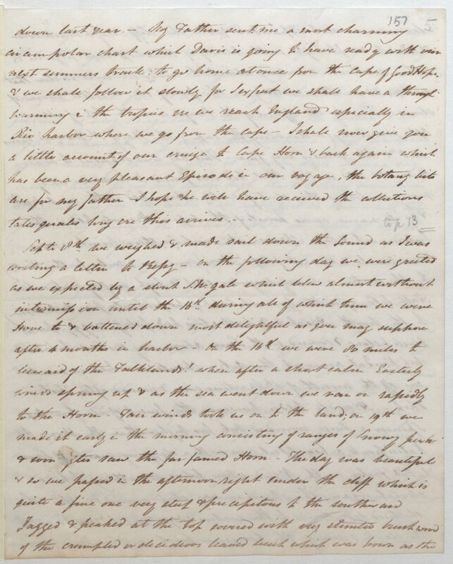 Sept[embe]r 9th we weighed & made sail down the sound as I was writing a letter to Bessy -- on the following day we were greeted as we expected by a stout S.W. gale which blew almost without interruption until the 16th during all of which time we were hove to & battened down most delightful as you may suppose after 4 months in harbour -- On the 16th we were 80 miles to leeward of the Falklands! when after a short calm Easterly wind sprung up & as the sea went down we ran on rapidly to the Horn. Fair winds took us on to the land; on 19th we made it early in the morning consisting of ranges of snowy peaks & soon after saw the far famed Horn. The day was beautiful & so we passed in the afternoon right under the cliff which is quite a fine one very steep & precipitous to the southward[.] Jagged & peaked at the top covered with very stunted brush wood of the crumpled or deciduous leaved bush which was brown as the