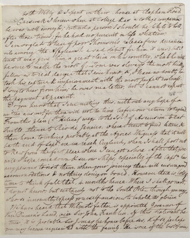 We have heard that Wilmot’s father is appointed Governor of Van Diemen's land [Tasmania], vice Sir John Franklin. If this statement be true; it is probable Sir F[ranklin] may be home before us, & if so, perhaps you may become acquainted with the family. He is one of the best of men,