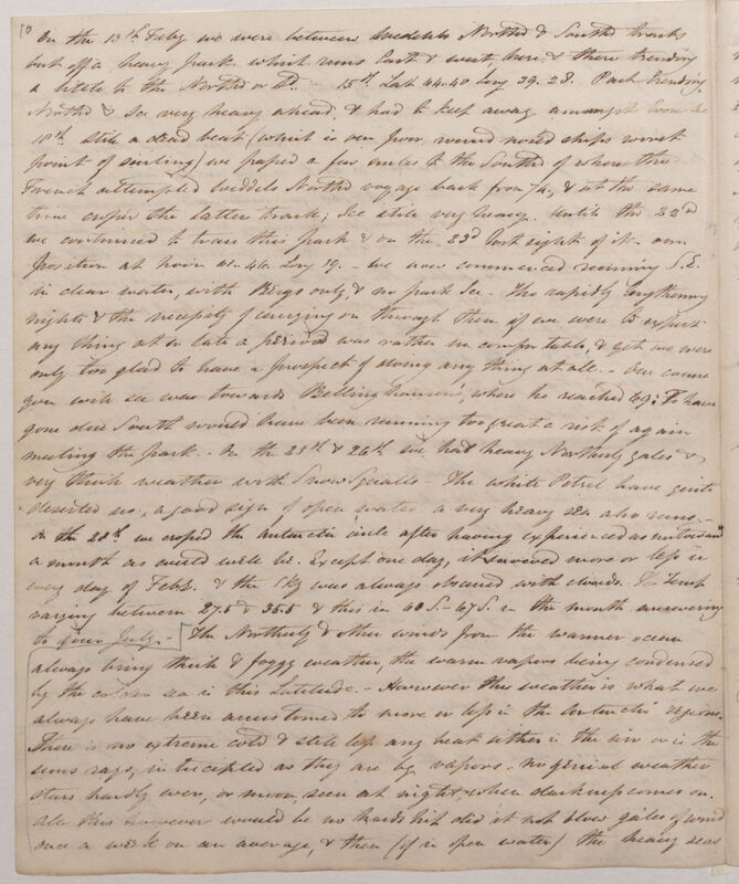 On the 13th Feb[ruar]y we were between Weddell's North[war]d & South[war]d tracks but off a heavy pack which runs east & west, here & there trending a little to the North[war]d or S[outhwar]d. 15th Lat 64. 40 Long 39. 28. Pack trending North[war]d. Ice very heavy ahead, & had to keep away amongst loose ice. 18th still a dead beat (which is our poor round nosed ships worst point of sailing) we passed a few miles to the South[war]d of where the French attempted Weddell's North[war]d voyage back from 74., & at the same time copied the latters track; ice still very heavy. Until the 22nd we continued to trace this pack & on the 23rd lost sight of it. Our position at noon 61. 46. Long. 19. -- We now commenced running S.E. in clear water, with Bergs only, & no pack ice. The rapidly lengthening nights & the necessity of carrying on through them if we were to expect any thing at so late a period was rather un comfortable, & yet we were only too glad to have a prospect of doing anything at all. Our course you will see was towards Bellingshausen's, where he reached 69'. To have gone due South would have been running too great a risk of again meeting the pack. On the 25th & 26th we had heavy Northerly gales & very thick weather with snow spells. The white petrel have quite deserted us, a good sign of open water. A very heavy sea also runs. On the 28th we crossed the Antarctic circle after having experienced as untoward a month as could well be. Except one day, it snowed more or less in every day of Feb[ruar]y. & the sky was always obscured with clouds. The temp varying between 27.5 & 35.5 & this in 60 S. -- 67 S. in the month answering to your July. *15The Northerly & other winds from the warmer ocean always bring thick & foggy weather, the warm vapours being condensed by the colder sea in this latitude. However the weather is what we always have been accustomed to more or less in the Antarctic regions. There is no extreme cold & still less any heat either in the air or in the suns rays, intercepted as they are by vapours. No genial weather[,] stars hardly ever, or moon, seen at night, when darkness comes on. All this however would be no hardship did it not blow gales of wind once a week on an average, & then (if in open water) the heavy seas