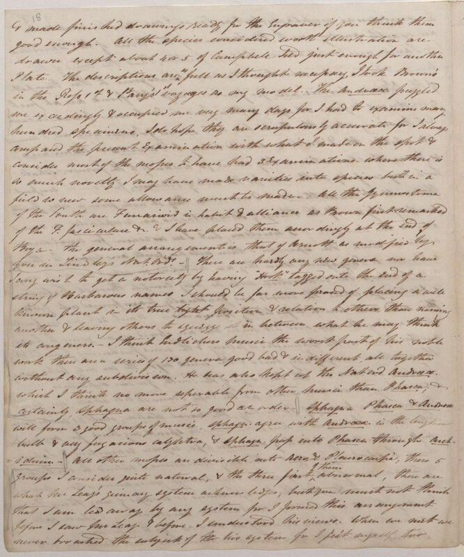 & made finished drawings ready for the Engraver if you think them good enough. All the species considered worth illustration are[,] except about 4 or 5 of Campbell Isl[an]d[,] just enough for another Plate. The descriptions are as full as I thought necessary, I took Brown's in the Ross 1st & Parry's 1st voyages as my model. The Andreaea puzzled me exceedingly & occupied me very many days for I had to examine many hundred specimens, I do hope they are scrupulously accurate for I always compared the present examination with what I made on the spot & consider most of the mosses to have had 3 examinations. Where there is so much novelty I may have made varieties into species but in a field so new some allowance must be made. All the Gymnostoma of the South are Funarioid in habit & alliance as Brown first remarked of the F. fasciculare &c. I have placed them accordingly at the end of the Brya[ceae]. the general arrangement is that of Arnott as modified by you in Lindley's Nat. Ords.*20. There are hardly any new genera nor have I any wish to get a notoriety of having "Hook" tagged onto the end of a string of Barbarous names[,] I should be far more proud of placing a well known plant in its true light position & relation to others than naming another & leaving others to squeeze it in between what he may think its congeners. -- I think Endlicher's Musci the worst part of his noble work[,] there are a series of 130 genera good bad & indifferent, altogether without any subdivision. He has also kept up the Nat. Ord. Andreaa which I think no more separable from other Musci than Phasca, & certainly Sphagna are not so good an order[.] Sphagna Phasca & Andraeae will form 3 good groups of Musci, Sphagna agree with Andraeae in thelengthened bulb & very fugacious calyptra, & sphagn. pass into Phasca through Anchiduim. *21All other mosses are divisible into Acro[carpi]. & Pleurocarpi, these 5 groups I consider quite natural & the three first of them abnormal, these are what Mr Leay's quinary system acknowledges, but you must not think that I am led away by any system for I formed this arrangement before I saw Mr Leay & before I understood his views. When we met we never broached the subject of the his system for I felt myself too