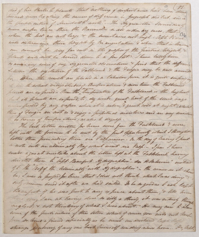 did of his British plants that "nothing of importance had been done towards investigating the causes of difference in Geograph[ical]. distrib[ution]. since the publication of Humboldts work". The Hygrometer I consider of more importance than the Barometer in all ordinary cases, that is where the Isl[an]ds are not large & the mountains not high. Capt[ai]n. Vidal will determine their heights by triangulation & when that is know one cannot be very far out in the guesses of the partial heights, & plants will not be bound down to a few feet. I have lately been examining some of my Hygrometer observations & find that the difference between the vegetation of the Falklands & the Fuegia may be well accounted for. When the results are placed in a tabular form it is quite surprising to see to what vicissitudes of temperature & moisture the Falkland plants are exposed. Now the mean temperature of the Falklands is the highest but its plants are exposed, to dry winds, great heat of the suns rays unimpeded by any vapor when it is calm, & great cold at night, whilst those of Fuegia are not so & enjoy a perpetual moisture and are very sensitive to extremes of temperature, as also to dryness.