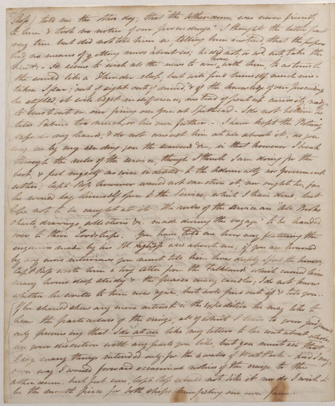 *28Ross) told me the other day, that "the Athenaeum was never friendly to him & took no notice of our proceedings." I thought the latter part very true but did not tell him so, telling him instead, that the papers had no means of getting news about us; he did not, or w[oul]d not, take the hint. -- He seems to wish all the news to come home with him, to astonish the world like a Thunder-clap; but will find himself much mistaken I fear; "out of sight out of mind", & if the knowledge of our proceedings be stifled, it will beget indifference, instead of pent-up curiosity, ready to burst out on our firing one gun at Spithead. I do not believe he tells Sabine too much, or his own father. -- I have kept the Botany safe in my hands, & do not consult him at all about it, as you may see by my sending you the seaweed &c, in that however I break through the rules of the service, though I think I am doing for the best, & feel myself no wise indebted to the Admiralty nor Government either; Capt[ai]n Ross however would not sanction it, nor ought he, for he would lay himself open to the Service; which I have done, but hope not to be caught at it. The rules of the service are "All books charts, drawings, collections &c. made during the voyage" to be handed over to their Lordships. You have told me how very flattering the enquiries made by R[oya]l. Highness*29 were about me, if you are honoured by any more interviews you must tell him how deeply I feel the honour; Capt[ai]n Ross wrote him a long letter from the Falklands which caused him many hours deep study & the purser many candles; I do not know whether he writes to him now again, but will find out if & tell you. *30If he should show any more interest in the Expedition he may like to hear the particulars of the cruize, all of which I leave to your judgement, only promising that I do not[*31] at all like my letters to be sent about whole. Use your discretion with any parts you like, but you must see that I say many things only intended for the 4 walls of West Park -- had I my own way I would forward occasional notices of the cruize to the Athenaeum, but feel sure, Capt[ai]n Ross would not like it nor do I wish to be the mouth piece for both ships trumpeting our own fame.