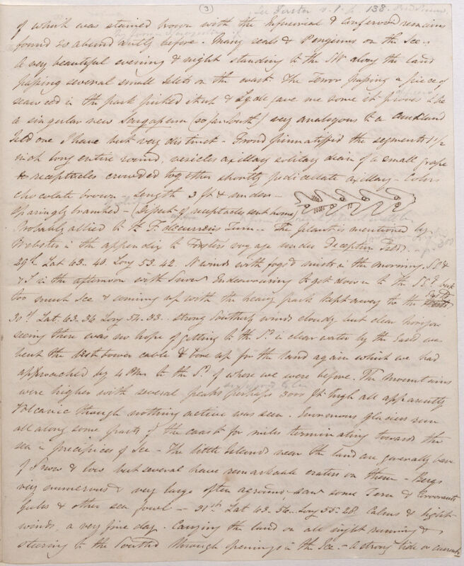 1. Annotated in pencil in another hand: '& what deeply interested the B[otanist]. in this high lat[itude] was', a second annotation reads 'of genus'. These & subsequent pancil notations in the letter appear to be edits in preparation for publishing the letter, which appeared in The London Journal of Botany vol. 2 (1843), which can be found online here: http://www.biodiversitylibrary.org/bibliography/235#/summary