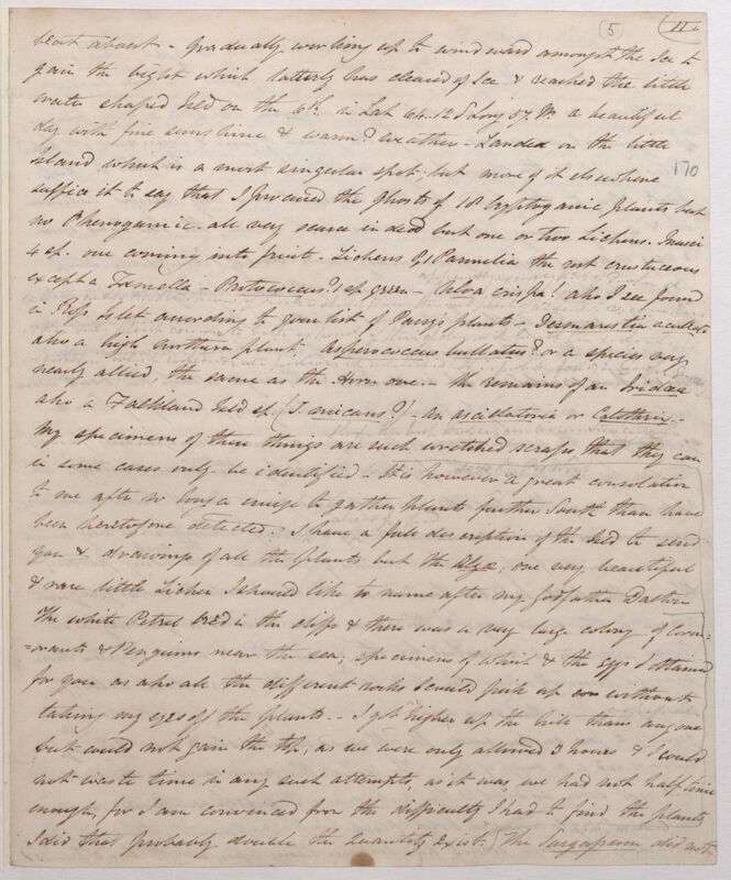 beat about. Gradually working up to wind ward amongst the ice to gain the bight which latterly has cleared of ice & reached the little crater shaped Isl[an]d on the 6th in Lat 64.12 S Long. 57. W. a beautiful day with fine sunshine & warm ? weather. Landed on the little island which is a most singular spot; but more of it elsewhere suffice it to say that I procured the ghosts of 18 Cryptogamic plants but no Phenogamic. All very scarce in deed but one or two Lichens. Musci 4 sp. one coming into fruit. Lichens 8, 1 Parmelia the rest crustaceous except a Tremella. Protococcus? 1 sp. green –Ulva crispa! *11 Also I see found in Ross Islet according to your list of Parry's plants. Desmarestia aculeata also a high northern plant, Asperococcus bullatus ? or a species very nearly allied, the same as the Horn one. -- the remains also of an Iridaea also a Falkland Isl[an]d. (I. micans ?). An Osciallatoria or Calothrix. My specimens of these things are such wretched scraps that they can in some cases only be identified. It is however a great consolation to me after so long a cruize to gather plants further South than have been heretofore detected. I have a full description of the Isl[an]d to send you & drawings of all the plants but the Algae; one very beautiful & rare little Lichen I should like to name after my Godfather Dalton[.] The white Petrel bred in the cliffs & there was a very large colony of Cormorants & Penguins near the sea; specimens of which & the eggs I obtained for you as also all the different rocks I could pick up without taking my eyes off the plants. I got higher up the hill than anyone but could not gain the top, as we were only allowed 3 hours & I could not waste the time in any such attempts, as it was, we had not half time enough, for I am convinced that from the difficulty I had to find the plants I did[,] that probably double the quantity exist. The Sargassum did not